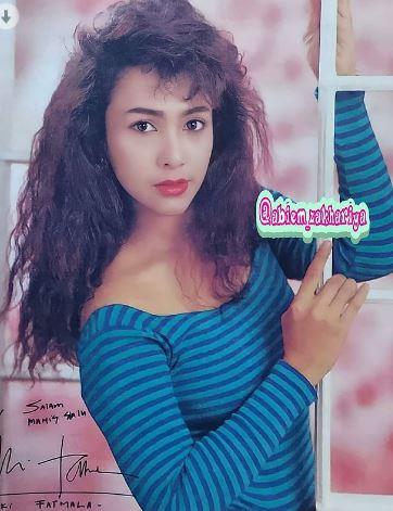 1. Berpose untuk buku sampul artis: Sejak muda. Kiki sering menjadi model untuk beberapa majalah. Ini adalah potret Kiki Fatmala ketika berpose untuk buku sampul artis, mengenakan kaus biru garis-garis berlengan panjang. Tampak cantik dengan rambut keriting yang sangat tren pada masa itu.