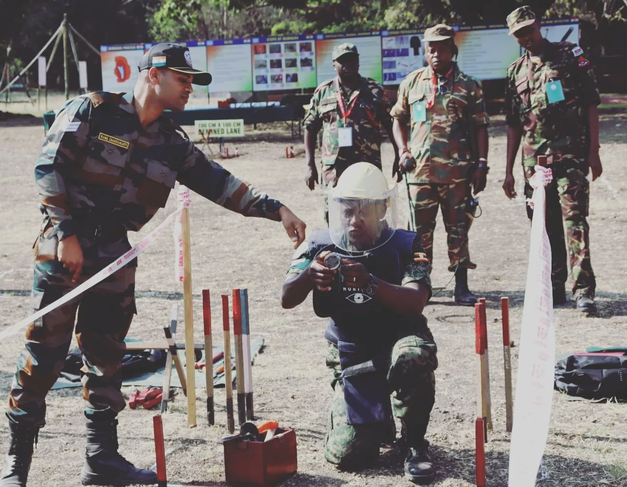 Para prajurit dari Afrika dan India berbagi taktik pembersihan ranjau dan membantu memastikan kedua pasukan itu dapat menafsirkan aturan keterlibatan dengan tepat sembari melakukan misi pemeliharaan perdamaian, demikian menurut Kementerian Pertahanan India.