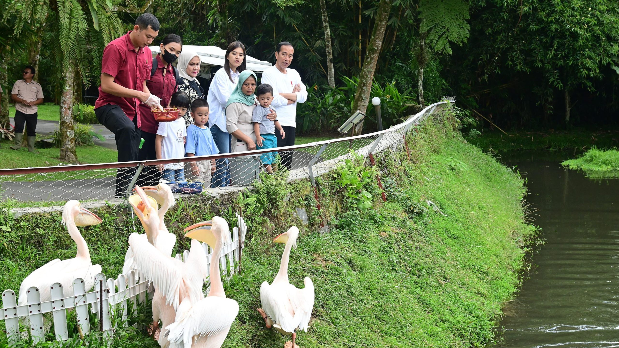Tak jauh dari sana, suasana menjadi riuh saat keluarga Presiden bergabung dengan kerumunan pengunjung lainnya di tepi danau. Di sini, mereka melempar potongan roti ke arah angsa dan bebek yang dengan riang berenang mendekat. Di tempat lain, sejumlah pelikan tampak berjemur, mengepak-ngepakkan sayapnya dengan anggun.