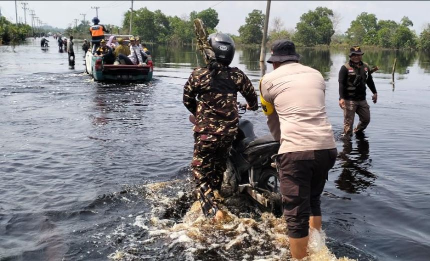 Personil dari Polsek Bunut, polres Pelalawan yang berada di lokasi banjir membantu mendorong kendaraan warga yang mogok untuk dibawa ke tempat yang aman. Anggota Polsek Bunut menyatakan masih banyak kendaraan yang menerobos banjir walau debit air cukup tinggi.