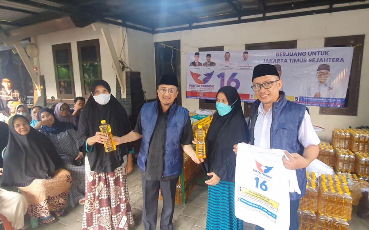 Yusuf Mansur dibersamai oleh Caleg Perindo DPRD Dapil DKI Jakarta VI, Wahyu Nur Iman, guna menghelat silaturahim dalam rangkaian bazar murah 1.000 liter minyak goreng Perindo.