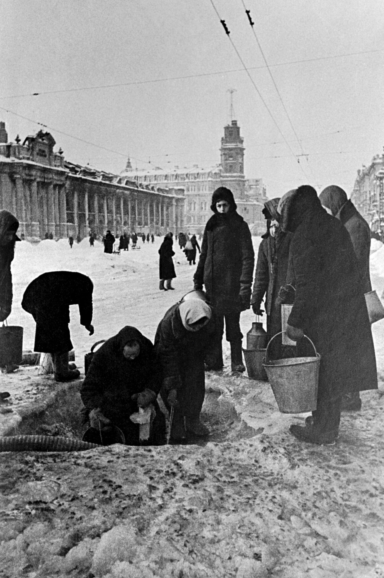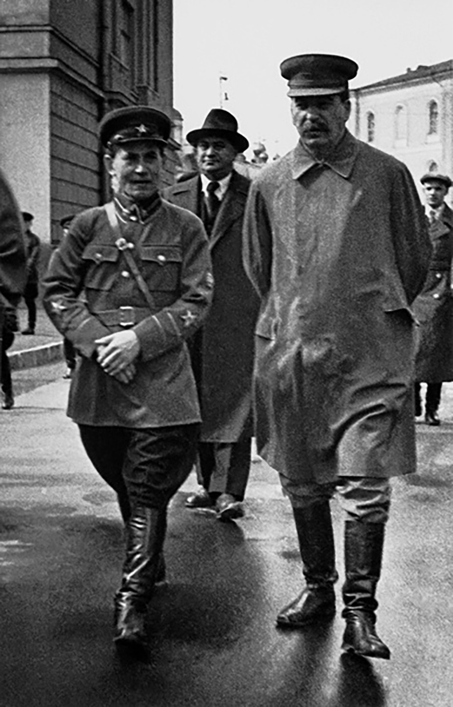 9. Demi mencari tahu apa yang terjadi dengan kerabat mereka, orang-orang terkadang menghabiskan berjam-jam mengantre di kantor NKVD. Penyair kenamaan Soviet, Anna Akhmatova, merefleksikan keadaan yang mengerikan itu dalam rekuiemnya. “Pada hari-hari Yezhovshchina (nama kepala NKVD, tampak bersama Stalin pada foto di bawah) yang mencekam, saya melewati 17 bulan dalam antrean luar pengunjung penjara di Leningrad ….”
