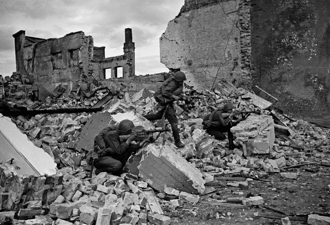 12. Setelah memenangkan perang, negara Uni Soviet pelan-pelan pulih dari kerugian yang sangat besar. Industri kembali memproduksi barang-barang untuk tujuan damai, sementara era budaya dan sinema Soviet dimulai.
