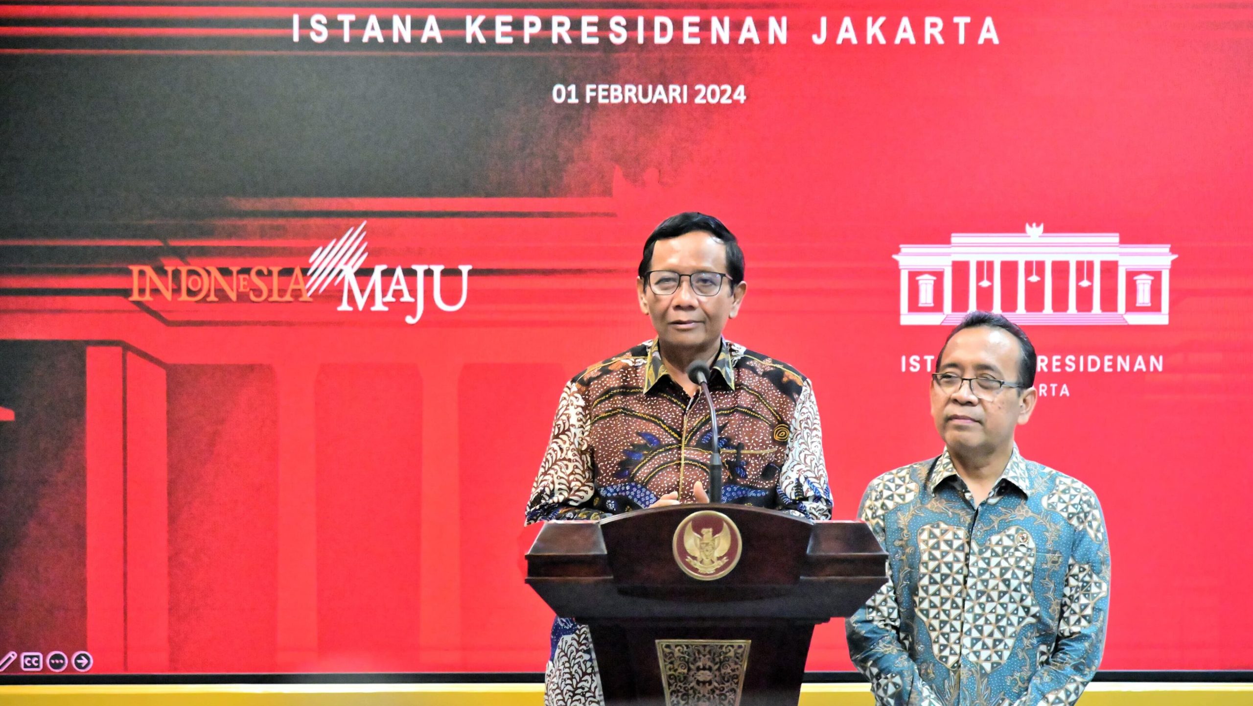 Presiden Joko Widodo didampingi Menteri Sekretaris Negara Pratikno menerima Menteri Koordinator Bidang Politik, Hukum, dan Keamanan (Menko Polhukam) Mahfud Md di Istana Merdeka, Jakarta, pada Kamis, 1 Februari 2024. Dalam pertemuan tersebut, Mahfud Md menyerahkan surat pengunduran diri dari jabatannya sebagai Menko Polhukam di Kabinet Indonesia Maju.