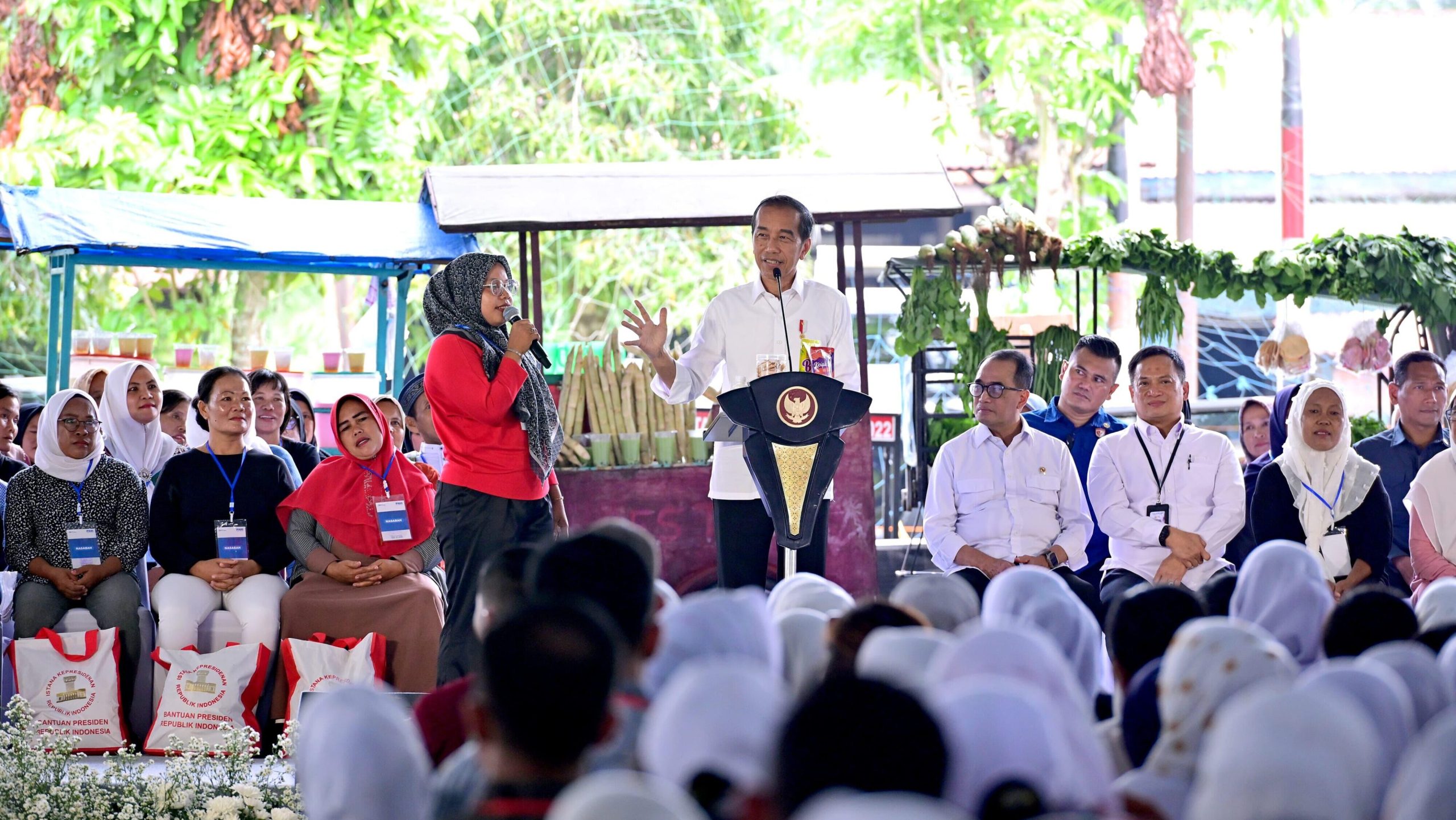 Presiden Joko Widodo bersilaturahmi dengan nasabah program Membina Ekonomi Keluarga Sejahtera (Mekaar) binaan Permodalan Nasional Madani (PNM) di Lapangan Lima Puluh, Kabupaten Batubara, Provinsi Sumatra Utara, pada Rabu, 7 Februari 2024. Dalam sambutannya, Kepala Negara menekankan pentingnya memiliki semangat dalam menjalankan usaha.