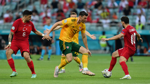 Pemain Wales Joe Rodon dan Joe Allen dari beraksi dengan Pemain Turki Burak Yilmaz, pada laga Euro 2020 di Stadion Olimpiade Baku, Baku, Azerbaijan, Rabu (16/6). Foto: Pool via REUTERS