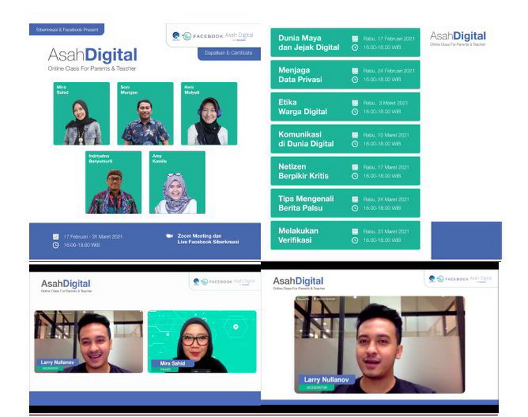 Pelatihan Asah Digital digelar secara virtual pada bulan Februari hingga 31 Maret 2021, dimana sesi pertama telah digelar pada 17 Februari lalu dengan mengangkat tema “Dunia Maya dan Jejak Digital”. Di sesi perdana ini, pelatihan ini menghadirkan Mira Sahid selaku wakil ketua umum Siberkreasi dan juga praktisi literasi digital, yang membahas mengenai pemanfaatan internet, mengenal identitas digital, bagaimana memilih informasi yang dapat dibagikan, dan mengapa mengamankan identitas digital itu penting.