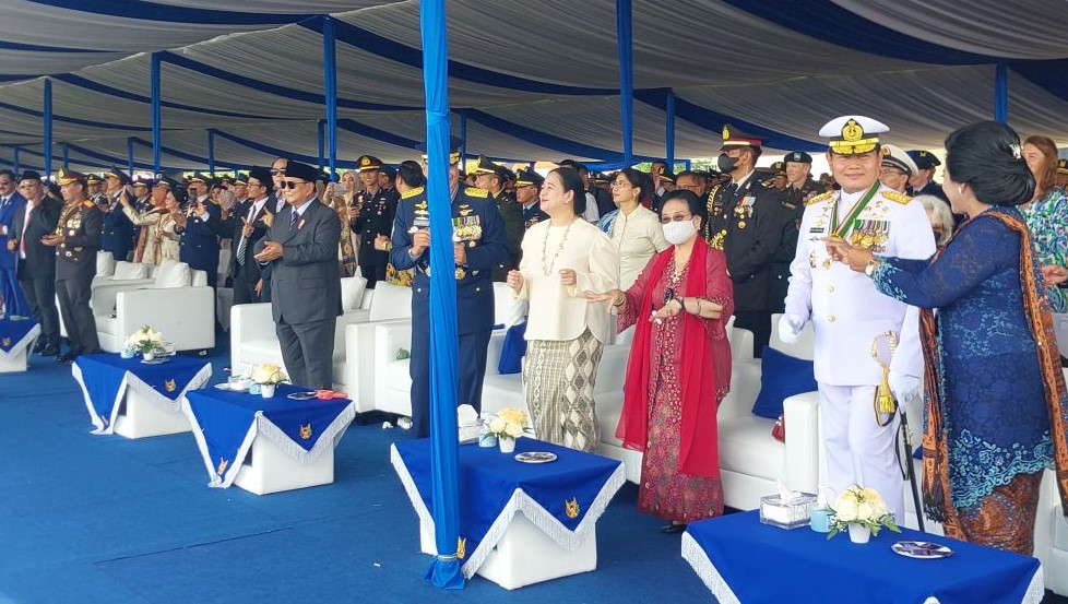 JAKARTA – Presiden RI kelima, Megawati Soekarnoputri bersama Menteri Pertahanan Prabowo Subianto, dan Ketua DPR RI Puan Maharani menghadiri perayaan Hari Ulang Tahun (HUT) ke-77 TNI Angkatan Udara pada Minggu (9/4/2023) di taxy way echo Lanud Halim Perdanakusuma, Jakarta Timur.