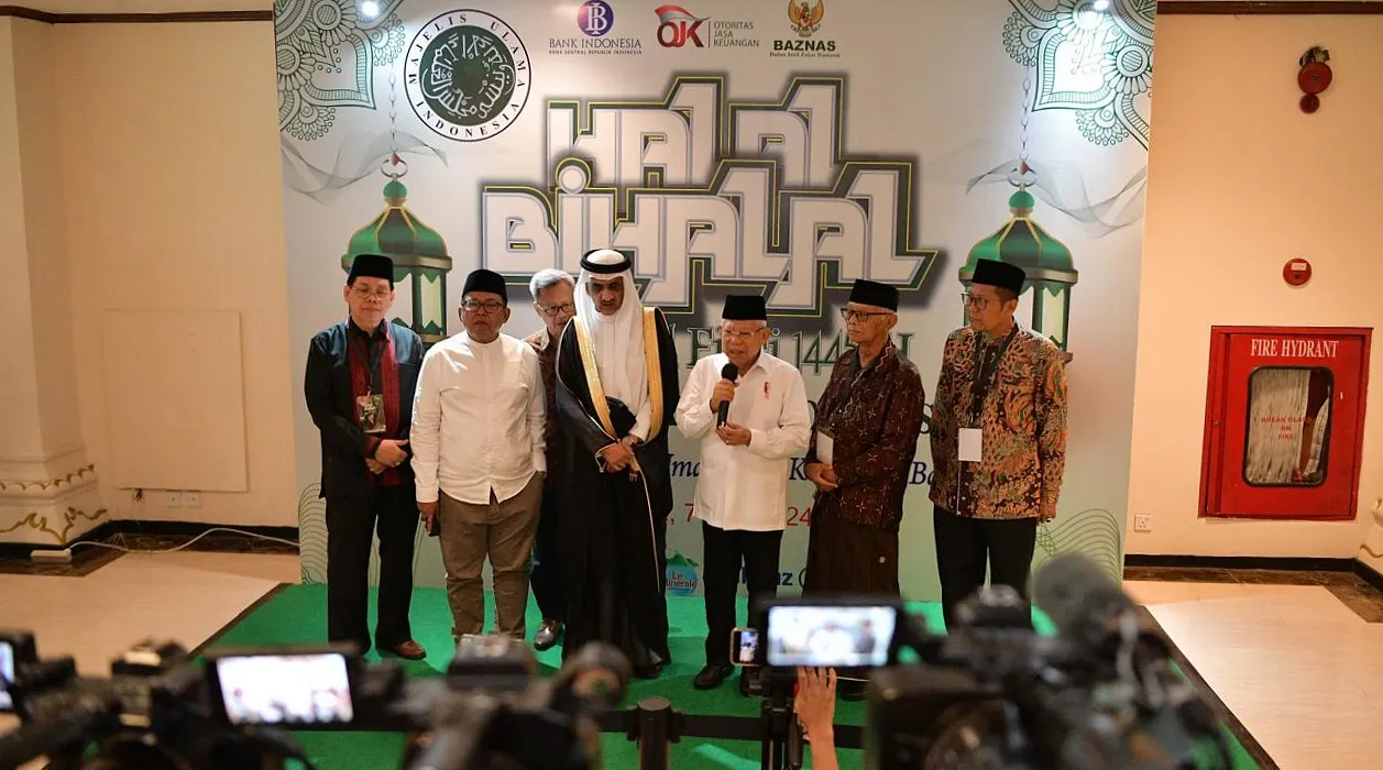 Mendampingi Wapres dalam keterangan pers kali ini, Ketua Umum MUI K.H. Anwar Iskandar, Ketua Panitia Halal Bihalal MUI M. Cholil Nafis, Duta Besar Arab Saudi untuk Indonesia Faisal bin Abdullah Al-Amudi, serta Staf Khusus Wapres Bidang Komunikasi dan Informasi Masduki Baidlowi. (EP/SK-BPMI, Setwapres)
