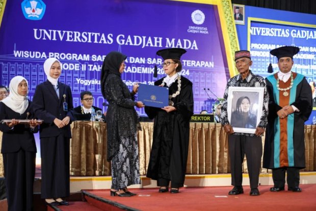 JAKARTA – Orangtua mahasiswa UGM menggantikan wisuda anaknya yang sudah meninggal dunia. Momen ini pun penuh haru.