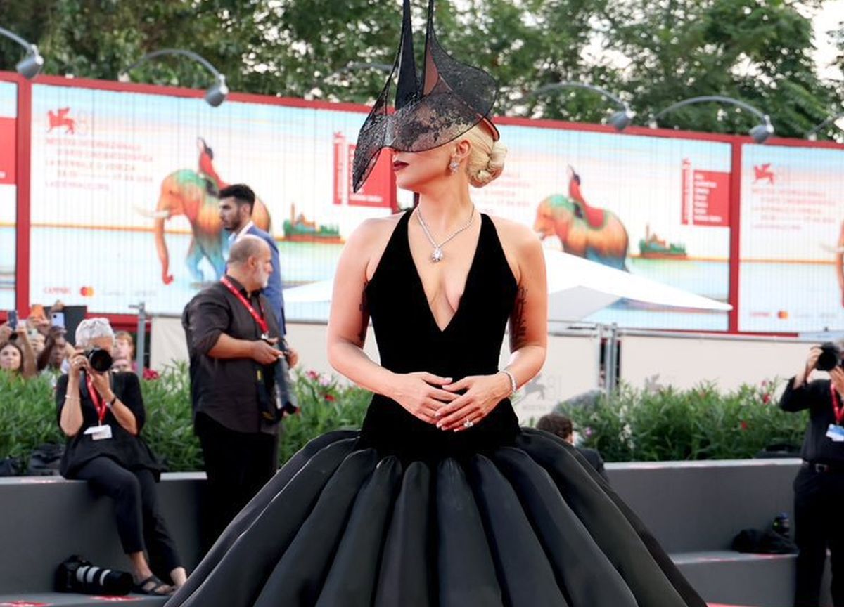 Sesampainya di Palazzo dei Casino, Gaga mengenakan gaun beludru hitam karya Dior, menghidupkan gaya Parisian chic yang abadi dan elegan. Gaun ini memiliki garis leher persegi yang simpel namun tetap modis, lengkap dengan lengan panjang yang sedikit melebar, menambah kesan dramatis.