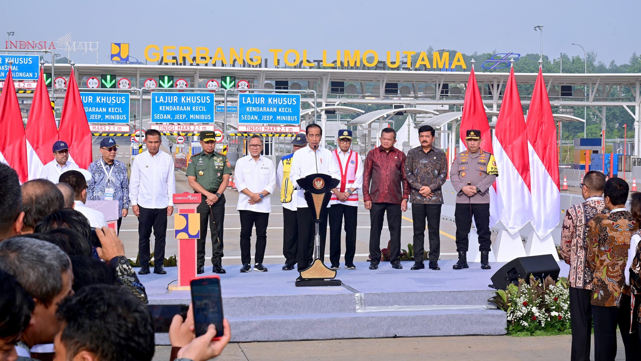Presiden Joko Widodo meresmikan jalan tol Pamulang-Cinere-Raya Bogor yang digelar di Gerbang Tol Limo Utara, Kota Depok, Provinsi Jawa Barat, pada Senin, 8 Januari 2024. Presiden menyebut jalan tol tersebut memiliki total panjang 14,8 km dengan total investasi sebesar Rp4 triliun.