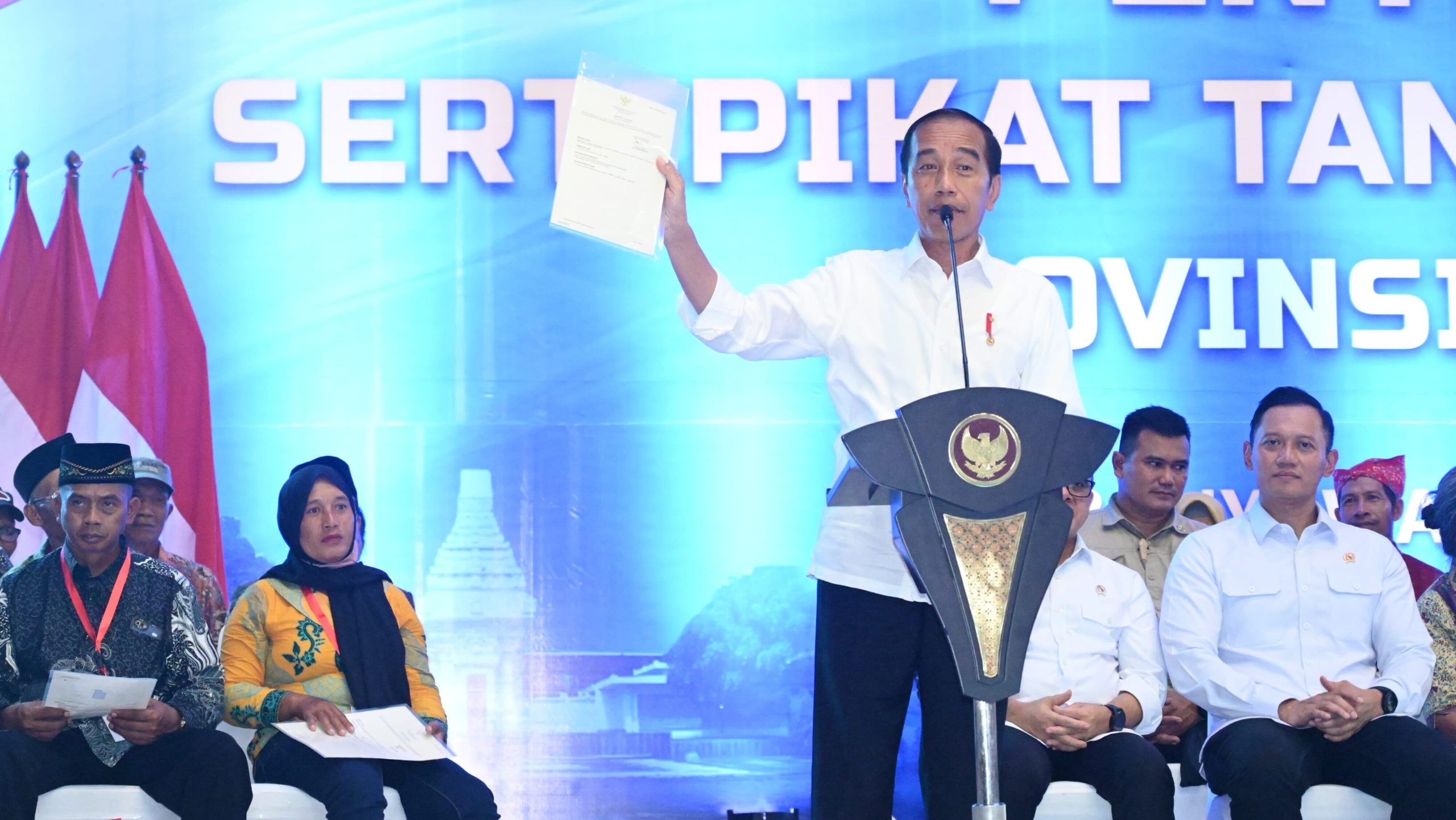 Presiden Joko Widodo menyerahkan 10.323 sertifikat tanah elektronik kepada masyarakat yang dipusatkan di GOR Tawang Alun, Kabupaten Banyuwangi, Provinsi Jawa Timur pada Selasa, 30 April 2024. Dalam sambutannya, Kepala Negara menyebut bahwa sertifikat tanah yang diberikan merupakan hasil program redistribusi tanah yang terbesar di Tanah Air.