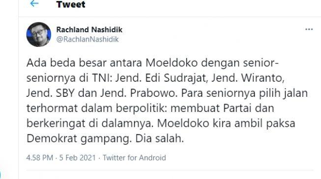 “Ada beda besar antara Moeldoko dengan senior-seniornya di TNI: Jend. Edi Sudrajat, Jend. Wiranto, Jend. SBY dan Jend. Prabowo. Para seniornya pilih jalan terhormat dalam berpolitik: membuat Partai dan berkeringat di dalamnya,” cuit akun @RachlanNashidik seperti dikutip Suara.com, Jumat (5/2/2021).