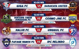 MNCTV menayangkan secara langsung dua pertandingan antara Bintang Timur Surabaya vs Cosmo JNE pada Sabtu, 22 Juli 2023, pukul 11.45 WIB dan Halus FC Jakarta vs Unggul FC Malang pada pukul 14.00 WIB yang digelar di GOR Kanjuruhan, Malang, Jawa Timur.