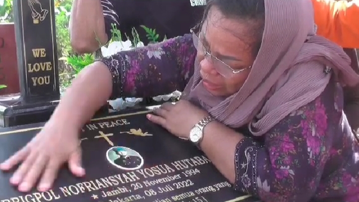 Ibu kandung Yosua itu tidak kuat menahan diri. Dia terlihat menangis sedih dan memeluk serta mengusap pusara anaknya yang terbuat dari batu marmer berwarna hitam.