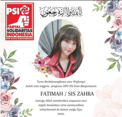 “Turut berbelasungkawa atas wafatnya salah satu anggota pengurus DPD PSI Kota Banjarmasin Fatimah atau Sis Zahra. Semoga Allah Ta’ala memberikan ampunan atas segala kesalahan serta memasukkan almarhum ke dalam surga-Nya. Aamiin,” bunyi ucapan belasungkawa yang diunggah akun PSI dikutip Rabu (9/2/2022).