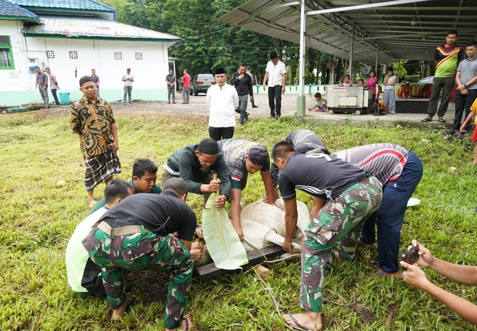 Prosesi pemotongan 3 ekor sapi dibantu oleh prajurit Makorem 012/TU, dengan harapan daging Meugang dapat bermanfaat bagi seluruh anggota Makorem 012/Teuku Umar dan Balak jajaran Korem 012/Teuku Umar serta keluarga besar Korem 012/TU.
