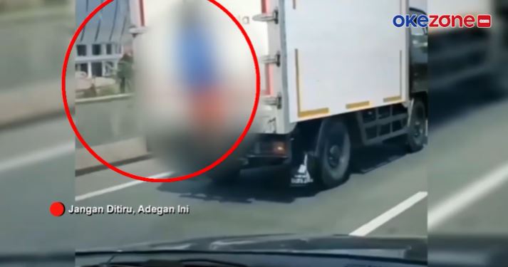 Terlihat dari video yang tersebar di media sosial bocah berkaus biru itu bergelantungan di belakang truk boks yang melaju dengan kecepatan tinggi.