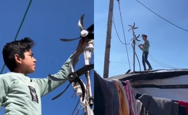 Dilansir unggahan viral akun Instagram @infopalestin, tampak seorang bocah laki-laki sedang berdiri di atas puncak kamp masyarakat Palestina dengan memegang kipas angin penghubung energi listrik.